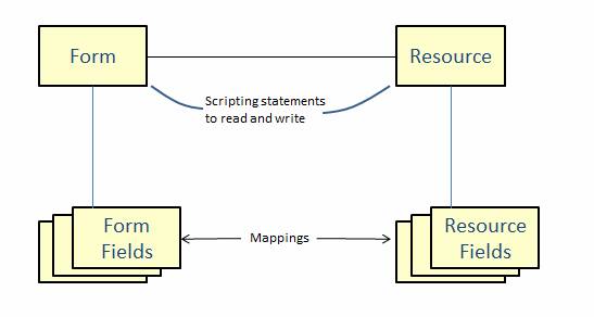 Each Resource contains resource fields and data is transferred between a resource and a Form using mappings which map resource fields to Form Fields. Resources are added to a form by adding or dragging them into the Resources View.