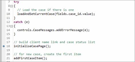 So in the example below, the on click event of button ButLJfw_3 is being executed – initially script searchClientsSimple is executed which at line 16 calls function showResults in script searchFunctions, which in turn at line 164 calls function setShowCaseLinks which is also in script searchFunctions. The thread is currently stopped in function setShowCaseLinks in script searchFunctions at line 183.