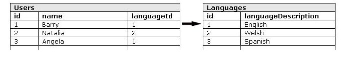 In the above example we have a list of languages identified by a unique number (id) in the Languages table. The Users table has a languageId column which contains a number, this number specifies a language using the unique id of a language in the Languages table. The languageId column is a foreign key.