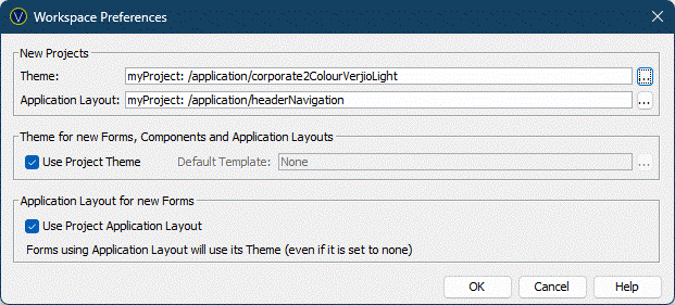 Application Layout: New Projects will automatically be assigned this Application Layout when they are created. Clicking the … displays the Workspace Browser dialog and any Application Layout in the Workspace can be selected. Newly created Projects will automatically be linked to the selected Application Layout Project. A Project’s Application Layout can be viewed and edited in its Properties. Note that if an Application Layout is selected, The Theme will be determined by the Application Layout.